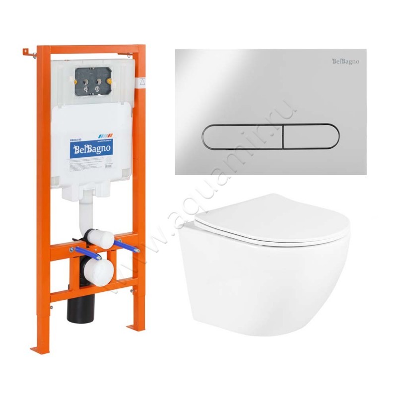 Комплект унитаза с инсталляцией BelBagno UNO с крышкой микролифт, 48,2 см, белый (BB3105CHR/SC + BB002-80 + BB005-PR-CHROME)