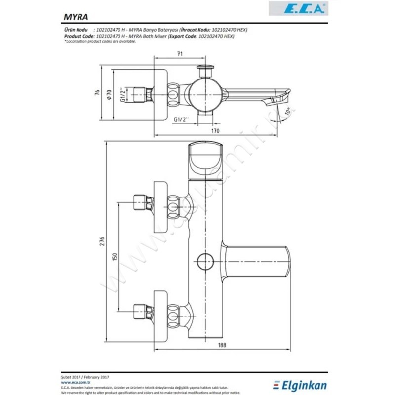 Смеситель для ванны E.C.A. Myra хром, артикул товара 102102470HEX, страна производства Турция.